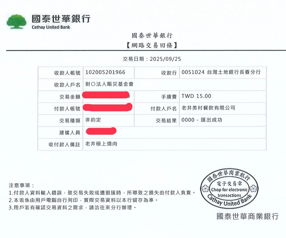 只要您捐款衛福部「馬太鞍溪堰塞湖災害募款專案」的朋友,不限金額來老井用餐,出示捐款證明,即可享該桌95折折扣。