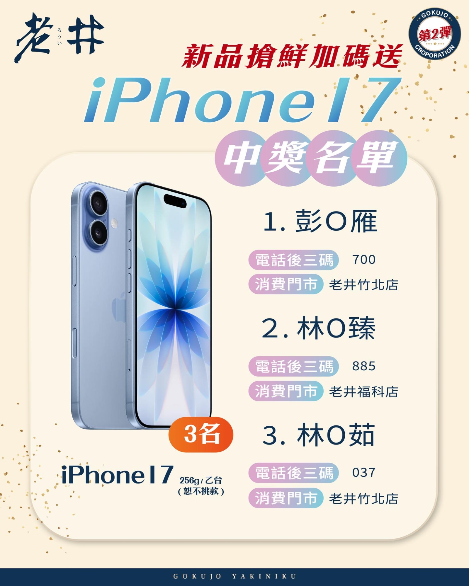 恭喜三位幸運兒獲得 iPhone 17 得獎者請留意『電話通知』 並可至APP電子券裡查收您的【中獎券】